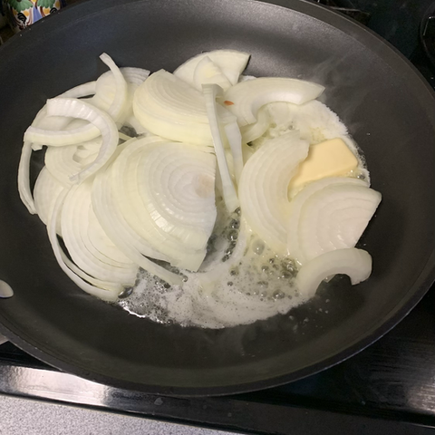 In a sauce pan melt the butter and add the slice onion. Turn the burner on low and cook 30-40 minutes until caramelized.
